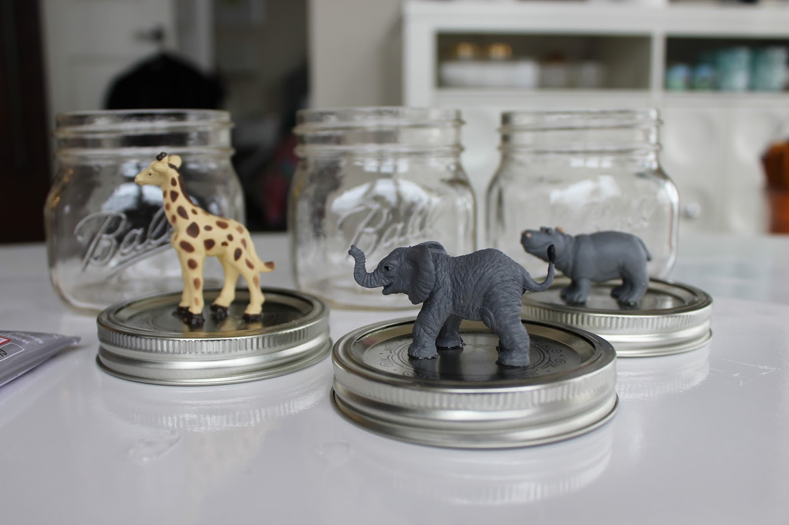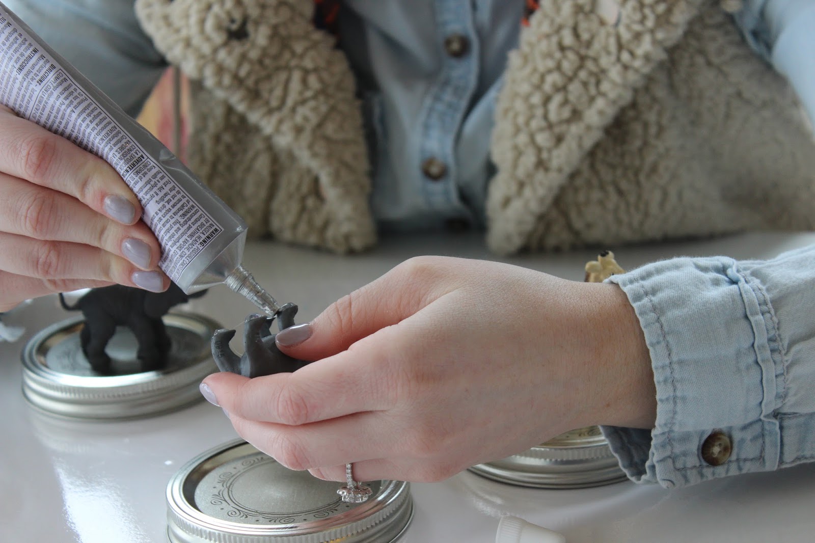 - Apply adhesive to the feet of the plastic animals and secure them to the center of the lid.