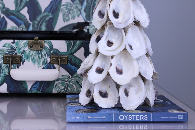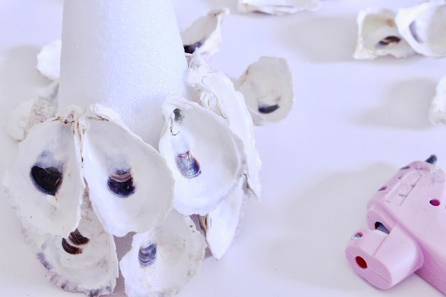 The tree was so EASY to make and it turned out pretty darn cute. All you have to do is use your hot glue gun to adhere the oysters to the foam tree starting from the bottom. HAPPY CRAFTING!