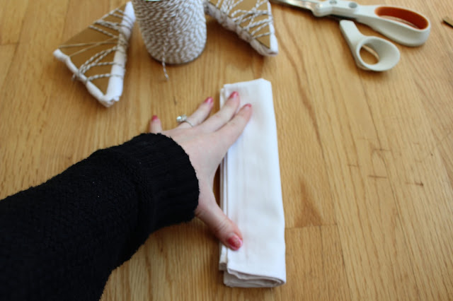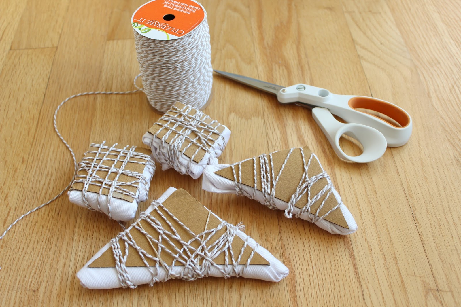For my Shibori, I wanted to create two types of patterns for my napkins (triangular and square). I cut out my shapes from a piece of cardboard, folded the napkins accordingly, placed the cardboard shape on top, and then bound the napkins with string. You can use rubber bands for this as well.