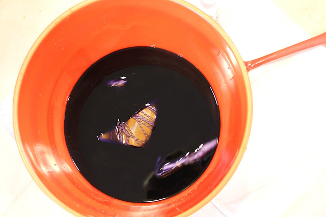Put on your rubber gloves, remove the napkins from the dye and remove the cardboard and string.
