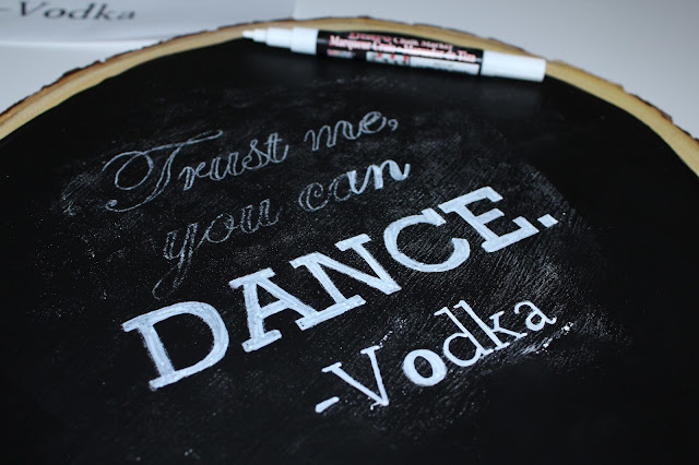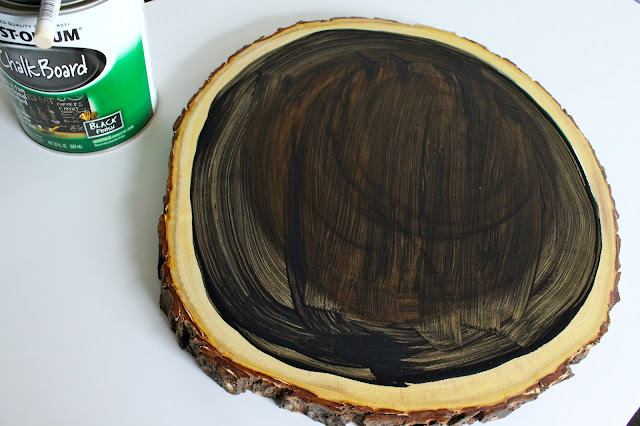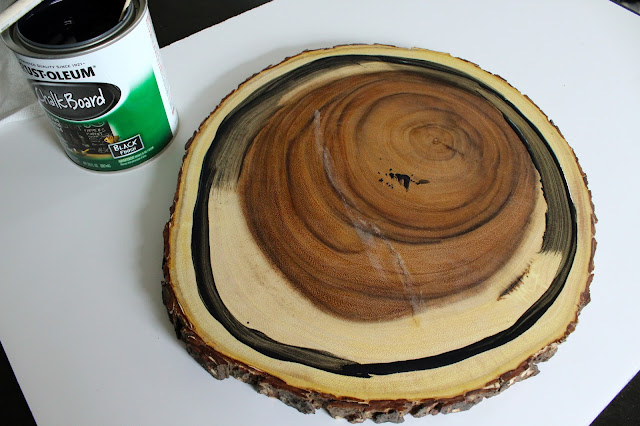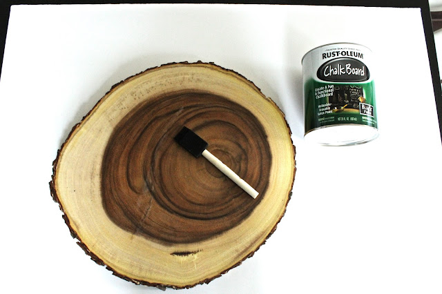 - Use your sponge brush and chalk paint to outline the circle on the wood slice. Fill in with even strokes.