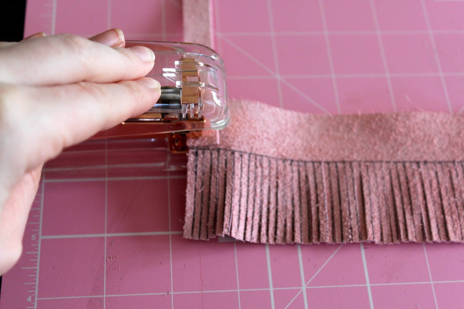- Attach the .5" x 4" piece of leather to the left edge of the fringed leather strip with a stapler.