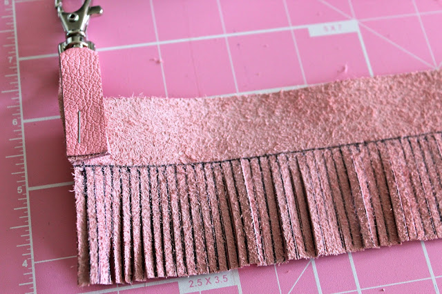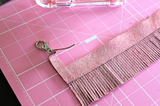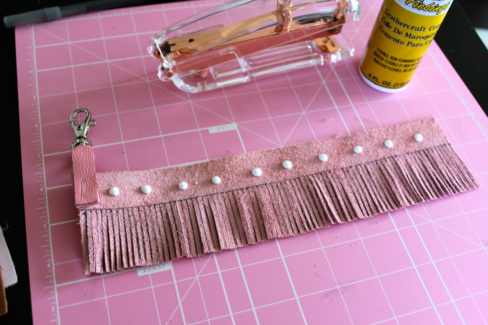 - Loop the .5"x 4" piece of leather through the snap hook and secure to the left hand corner of the fringed leather strip with the stapler again.