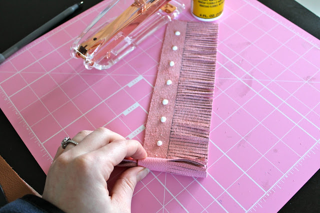 - Apply dabs of leather cement about 1" apart along the top of the fringed leather strip.