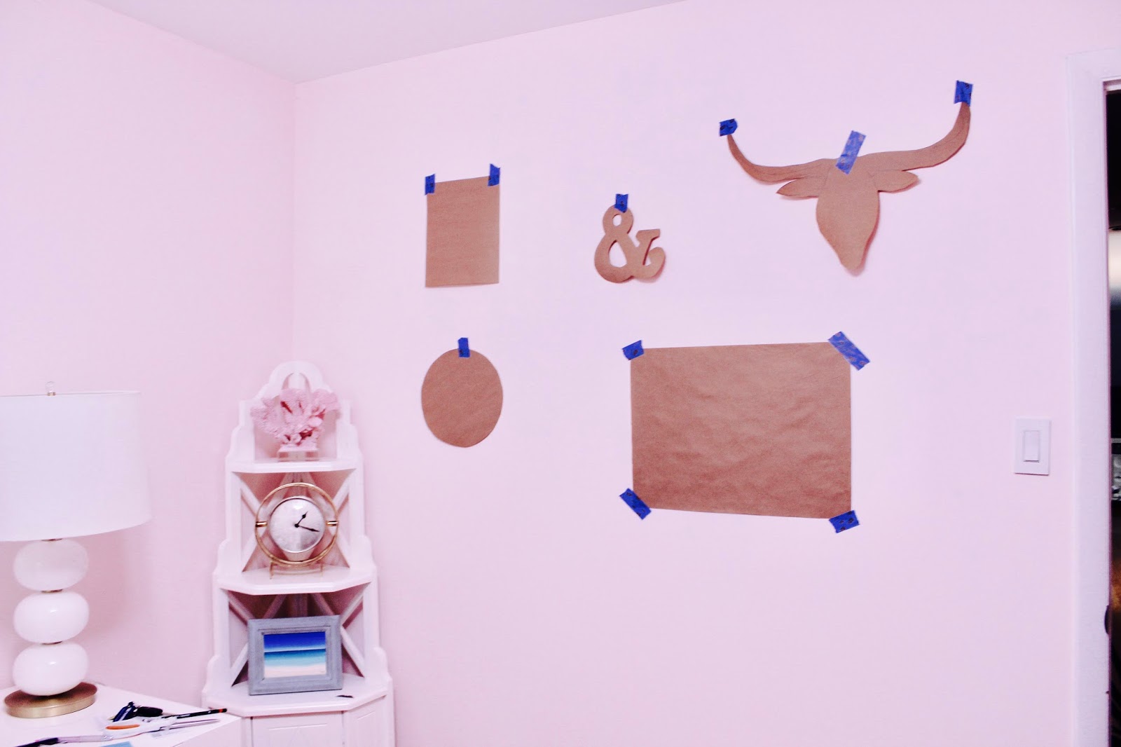 - Patience is key in creating a gallery wall. Take the time to trace and cut out shapes of paper that match the dimensions of your wall items. You can then use painter's tape to hang the silhouettes on the wall. This will allow you to step back and play with your arrangement design.